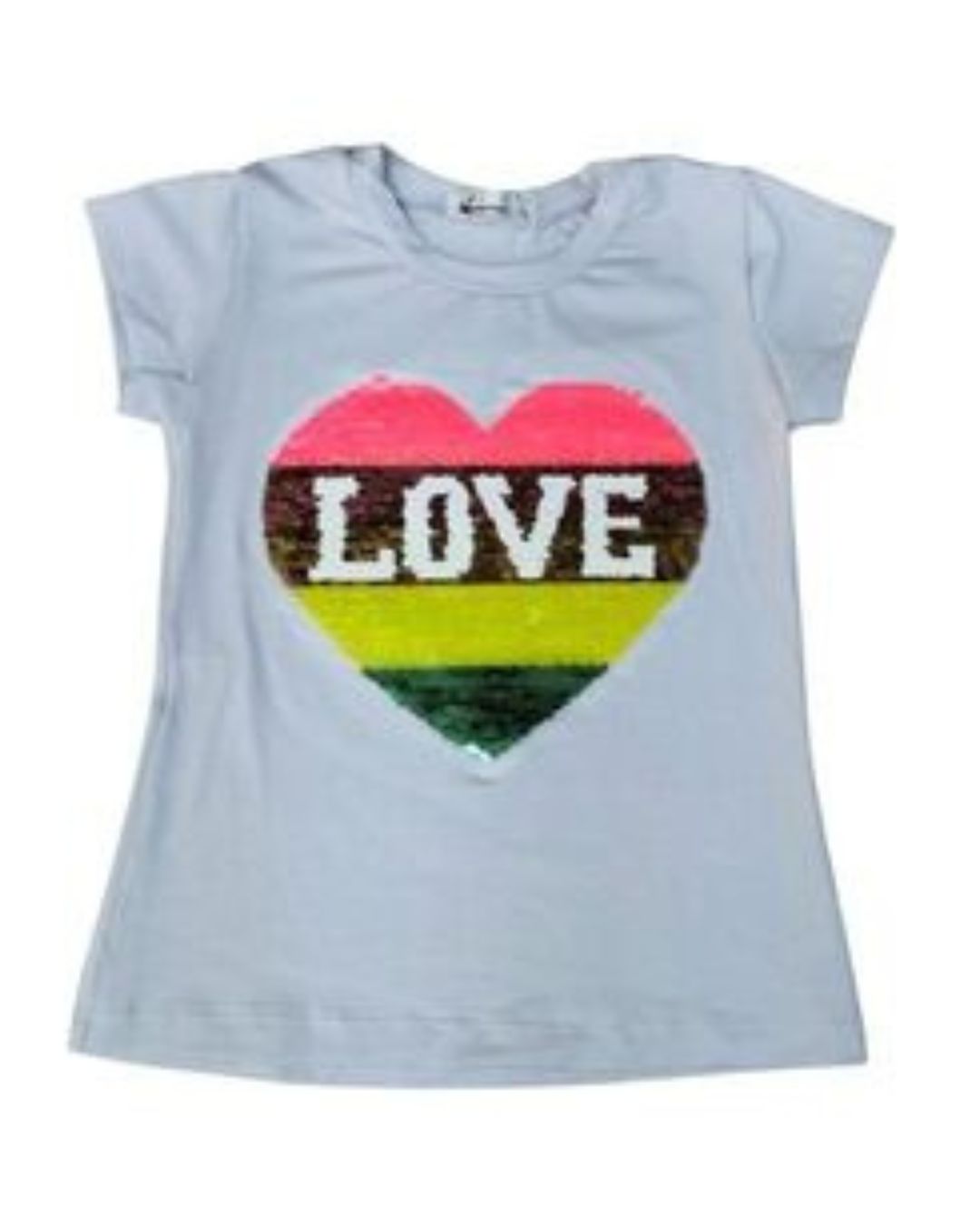 Camiseta Branca confeccionada em malha com toque suave e exclusivo aplique de Coração em paetê colorido com cores neons .Perfeita para compor looks coloridos e divertidos que nossas pequenas amam!