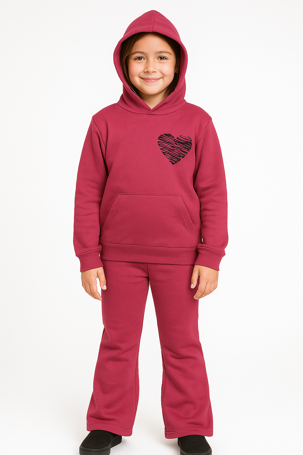 Esse é o nosso conjunto Pink coração de moletom Peluciado,quentinho e ideal para os dias frios de inverno. Ele é composto por uma blusa flanelada de moletom modelo canguru e capuz ,com uma linda estampa de coração na cor preta nas costas que dá um charme especial à peça, também acompanha uma calça flanelada jogger lisa na cor pink. Sua pequena vai amar desfilar com conforto e beleza que só nossa marca te oferece!!!