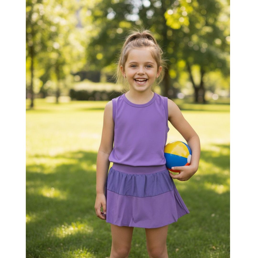 Conjunto desenvolvido em fluyti ,toque geladinho muito macio e maleável, composto por regata e shorts saia. A regata possui recorte nas costas com detalhe em tecido telado, na mesma cor do tecido da peça, dando um efeito muito moderno e descolado. O shorts saia possui shortinho costurado embaixo da saia, proporcionando muito conforto e liberdade de movimentos, além de um lindo detalhe em tecido telado que confere muito charme à peça.